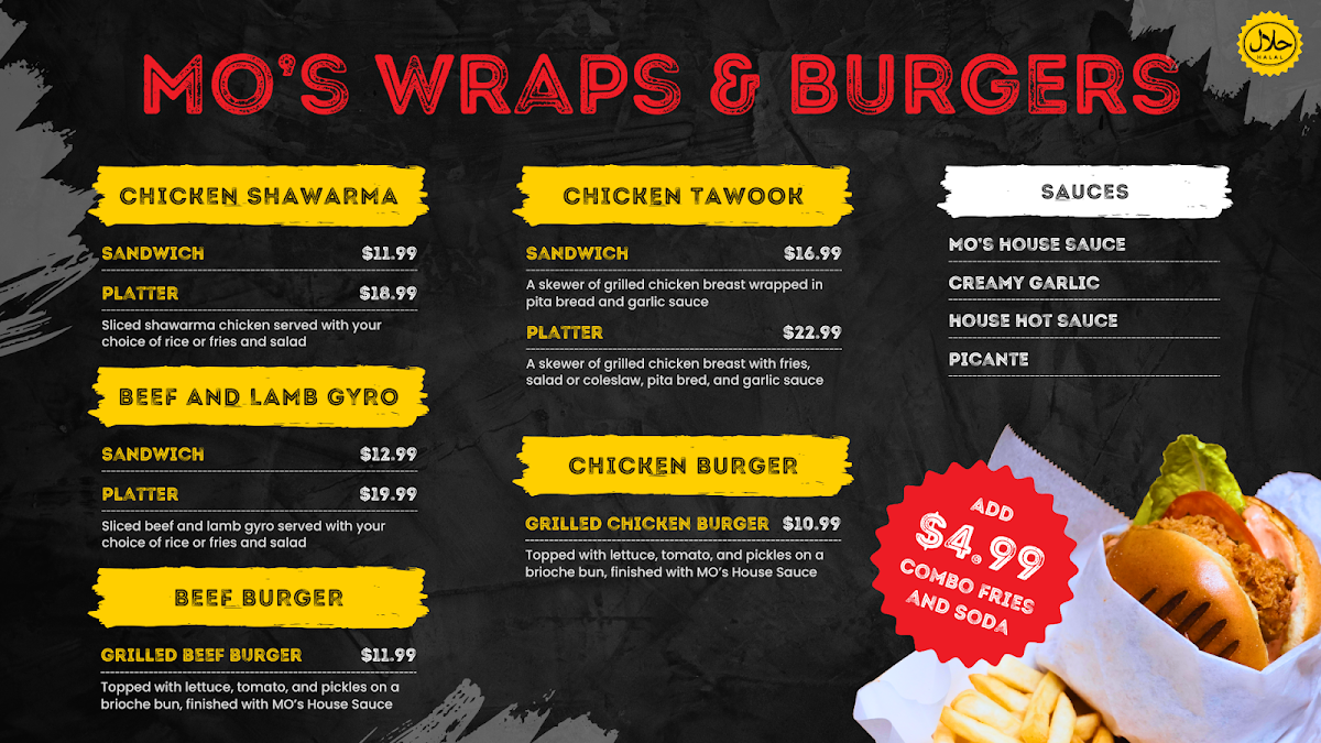 5.0 oz.100% ground halal beef patty grilled to perfection and comes loaded at no extra cost with your choice of fresh lettuce , tomatoes, onions, cheese, pickles and our delicious MO’S house sauce inside a toasted brioche bun.