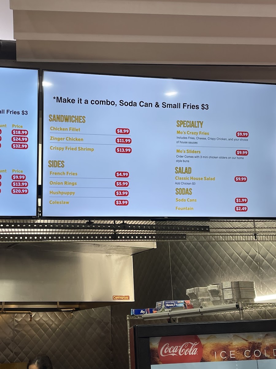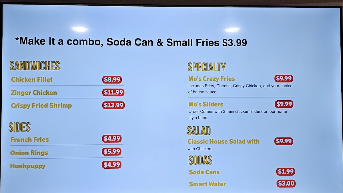 Wrapping up my look at Mo’s Fried Chicken in Tysons (Tysons, VA 22102, United States), the menu feels like it’s built for both quick cravings and shareable feasts, with plenty of variety beyond the expected. If you’re coming for boxes, the Mo’s Boxes lineup stands out with options like Shrimp Box, 6 Pieces Spicy Chicken Fillet (MO’Sahab) مسحب, and Nuggets Box 9 Pieces Spicy Chicken Fillet (MO’Sahab) مسحب-great for a no-fuss, ready-to-go meal. Tender lovers can dive into Fried Chicken (Jumbo tenders) with sizes like 2 Pieces Tenders, 4 Pieces Tenders, 5 Pieces Tenders, 6 Pieces Tenders, and 9 Pieces Tenders, while traditionalists can stick to Fried Chicken (bone-in chicken) in 2 Pieces Bone In, 3 Pieces Bone In, 4 Pieces Bone In, 6 Pieces Bone In, or 9 Pieces Bone In. To round things out, sides like Small Fries, Large Fries, Onion Rings, Vegetables Sambosh (4 Pieces), and even Large Salad With Fried Chicken Nuggets add solid variety. The sandwich section adds a halal street-food vibe with Halal Beef And Lamb Gyro, Lamb Yiros, Chicken Shawarma, Mo’s Chicken Fillet, and the spicy pick Spicy Zinger Wrap. For bigger appetites, the platters-Chicken Yiros Platter, Beef And Lamb Gyro Platter, Chicken Shawarma Platter, and Lamb Yiros Platter-feel like the heartier sit-down choice, and the NEW: Whole Chicken Mahdbi With Rice, Salad & Hot Dagoos Sauce sounds like the ultimate centerpiece order. Don’t skip the flavor boosts either: Creamy Garlic Sauce, Barbecue Sauce, MO’S House Sauce, Additional Sauces, and MO’S Hot Sauce make mixing and matching part of the fun. Add in Mo’s Jumbo Wings (4 Pieces Wings, 6 Pieces Wings, 9 Pieces Wings, 12 Pieces Wings), specialties like Crazyyy Fries Dish, Sliders, and Shrimp Box With Fries, plus drinks (Coke Bottle, Sprite Bottle, Fanta Bottle, Vimto Can, Barbican Pomegranate) and sweets (Square Baklava, Triangle Baklava), and it’s a menu that lands somewhere between comfort food and halal-inspired fast casual-with enough choices to keep repeat visits interesting.